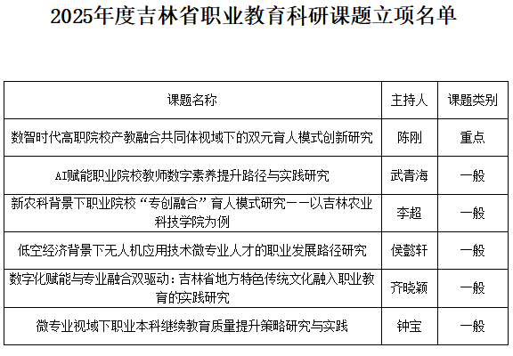 近日,2025年度吉林省职业教育科研课题立项评审结果公示,我校教育教学研究工作再获佳绩。经学校推荐、专家评审及省职教学会终审等多轮严格筛选,我校共有6项课题成功获批立项。